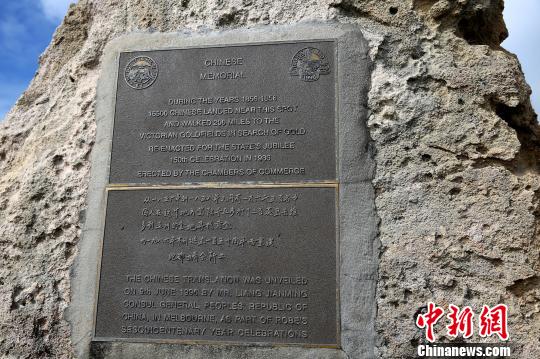 紀念約160年前大批中國淘金客登陸的碑文。 賴海隆 攝