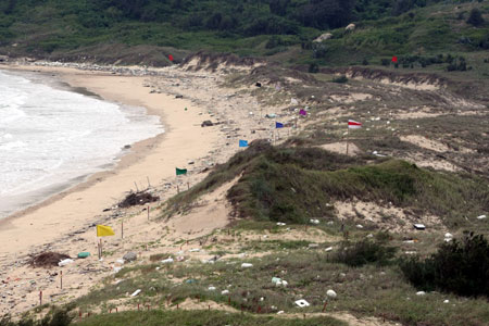 金門現有列管雷區一百五十三處,埋設地雷約七萬余枚。圖為金門山后海灘編號231-020雷區。