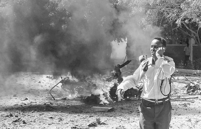二月十七日,索馬里摩加迪沙一警察局發生汽車炸彈爆炸,一名警察在現場打電話請求援助。新華社發