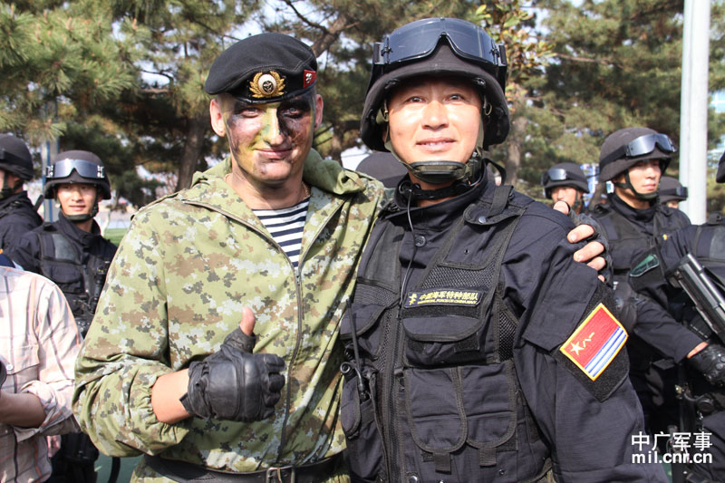 2012年4月23日下午,在俄方參演軍艦停靠的碼頭上,參加“海上聯(lián)合-2012”中俄海上聯(lián)合軍事演習(xí)的中俄雙方海軍特戰(zhàn)隊員進行表演交流。圖為帶隊表演的中俄雙方特戰(zhàn)隊軍官。攝影:穆亮龍