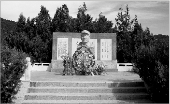在紀(jì)念館上方的碑地入口處有一座牌樓,上面所刻的“白乙化烈士千古”正是原八路軍冀熱察挺進(jìn)軍司令員蕭克的手筆。穿過牌樓,一條石板鋪成的甬道直抵山頂。莊嚴(yán)肅穆的白乙化烈士紀(jì)念碑就矗立在這巍峨的山頂上。5米見方的碑座由花崗巖條石砌成,上有漢白玉圍欄,四周栽植的柏樹茂密挺拔,上面系著前來憑吊者帶來的小白花。