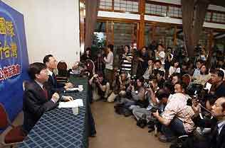 劉兆玄(左前一)周一召開臺灣新當局“內(nèi)閣”人事公布記者會,公布首波“閣員”名單共17人。(臺灣東森新聞圖片)