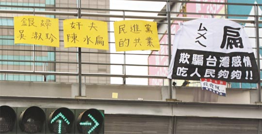 臺中市文心路及大雅路口的天橋上,日前出現(xiàn)“銀婦吳淑珍、奸夫陳水扁”、“欺騙臺灣感情,吃人民夠夠”海報及布條,讓人側(cè)目。(臺灣《聯(lián)合報》圖)