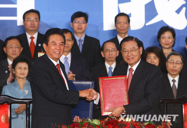 11月4日,陳云林與江丙坤交換協議文本。當日,海協會會長陳云林與海基會董事長江丙坤在臺北就海運直航等簽署協議。 新華社記者邢廣利攝