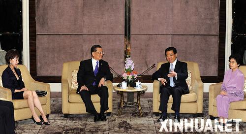 11月14日,中共中央總書記胡錦濤和夫人劉永清在新加坡會見中國國民黨榮譽主席連戰和夫人連方瑀。(圖片來源:新華社)