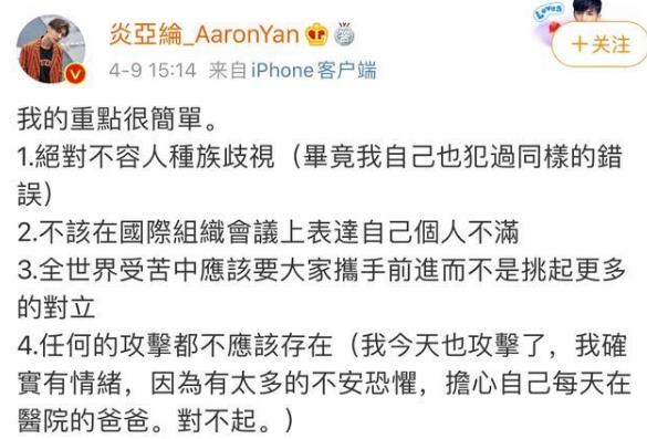 炎亞綸在其臉書以英文指責(zé)譚德塞“誤導(dǎo)”世界,還指責(zé)稱“你竟然有勇氣在一次國(guó)際組織會(huì)議上發(fā)表你自己個(gè)人的屎一樣的言論”,“你為什么不干脆閉嘴、閉上你的臭嘴,做好自己的工作!”該言論立刻引發(fā)兩岸網(wǎng)民關(guān)注和爭(zhēng)議。其后,炎亞綸又對(duì)此發(fā)文進(jìn)行“解釋”,呼吁網(wǎng)民不要上綱上線。