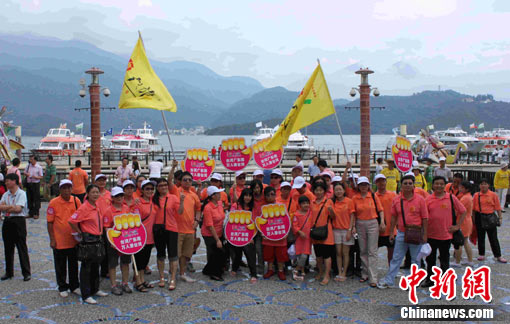 今年前7個月,臺灣著名景區日月潭接待到訪大陸客數量達到70萬人次,令同期景區到游人數達到400萬人次,連連刷新紀錄。圖為8月19日,來自廣州的“萬人游臺灣”的游客興高采烈地在日月潭前廣場上拍照留念。(圖片來源:中新社)