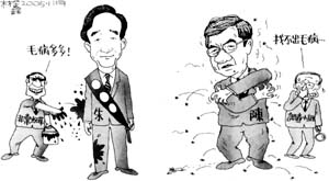 2007年11月,扁當局不顧島內各界的普遍反對,堅持要將“大選”和“公投”捆綁進行、讓“立委”和“公投”采取一階段領票,這算什么招?這明明在告訴人們:“中選會我家開,游戲規則由我定,不服別來玩兒”。至于這樣的游戲規則是否踐踏了“公平、公義”,會不會導致投票場面混亂和選舉爭議,他們才不關心呢。有人想拒絕?“行政院”除了有“罰則”,還有針對個人的狠招——不聽話的公務員小心退休金泡湯;扁把話說得更直接:“搞怪的縣市,全部來宣布選舉無效”,還威脅說:“郝龍斌你好膽、有本事,票不讓我領,我當‘總統’不是當假的。”綠營內甚至傳出了要扁宣布“戒嚴”的聲音。島內媒體將扁當局的表現比作“黑社會老大作派”,可就算是黑社會老大,也未必敢把這樣惹眾怒的事情做得這般赤裸裸吧? |