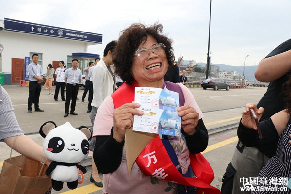 玉環(huán)市大麥嶼港對臺海上直航第20萬人次幸運旅客劉細妹獲贈“中遠之星”往返船票一套。