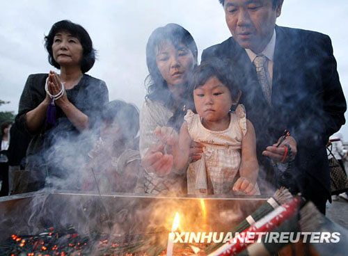 8月6日,在日本廣島和平紀念公園,一家人為廣島原子彈轟炸的死難者焚香祈禱。新華社/路透