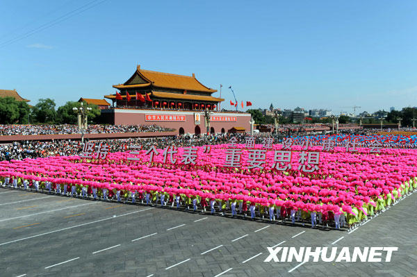 10月1日,首都各界慶祝中華人民共和國(guó)成立60周年大會(huì)在北京舉行。新華社記者陳樹(shù)根攝 這是“與時(shí)俱進(jìn)”標(biāo)語(yǔ)方陣通過(guò)天安門(mén)廣場(chǎng)。