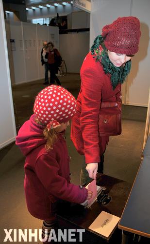 3月6日,在冰島雷克雅未克,一名婦女帶著孩子在市政廳投票站投票。冰島當日就賠償英國和荷蘭儲戶損失的議案啟動全民公決。 新華社記者和苗攝