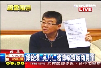 據(jù)報(bào)道,邱毅今天出示資料說,“吳乃仁當(dāng)時(shí)擔(dān)任臺(tái)糖董事長,龔照勝是擔(dān)任證券交易所董事,回來以后不到半年,龔照勝就接了臺(tái)糖董事長,接著當(dāng)了‘金管會(huì)主委’,吳乃仁就接了臺(tái)灣證券交易所的董事長,當(dāng)時(shí)接受游戲橘子(廠商)的招待,到濟(jì)州島皇冠假日賭場賭博,輸?shù)舻腻X全都是由游戲橘子幫他們負(fù)擔(dān),而且一賭就輸?shù)袅?00多萬港幣,這個(gè)叫小賭嗎?”