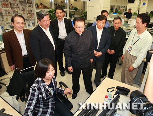 5月16日深夜,中共中央政治局常委李長春先后來到新華社和中央電視臺,代表黨中央、國務院和胡錦濤總書記,看望慰問抗震救災新聞工作者,向奮戰在抗震救災宣傳報道第一線的全體同志致以親切的慰問和崇高的敬意。中共中央政治局委員、書記處書記、中宣部部長劉云山一同看望慰問。 這是李長春在新華社新聞信息發稿中心聽取抗震救災圖片發稿情況匯報。 新華社記者 龐興雷 攝