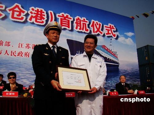 二00八年十二月十五日上午,裝滿(mǎn)集裝箱的“天福”輪一聲長(zhǎng)鳴,太倉(cāng)港至臺(tái)灣港航線(xiàn)從此告別繞道日本石垣島的歷史,直接駛向臺(tái)灣。首航前,江蘇海事局副局長(zhǎng)韋之杰向“天福”輪曲延杰船長(zhǎng)鄭重頒發(fā)了船舶直航臺(tái)灣出口許可證。 中新社發(fā) 丁梅 攝