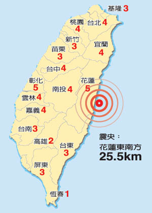 昨晚發生的里氏6.8級地震,是自2006年12月26日發生的恒春里氏7級地震以來臺灣發生的最大地震,釋放能量相當于8顆原子彈。到今天清晨5時為止,共有106起余震,其中比較強的余震有15起,規模在3.9到4.8級之間。最近的一起是在今天凌晨4時33分,規模4.7級。