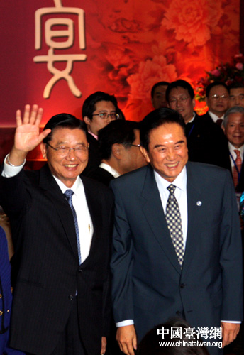 21日晚間,海基會設(shè)宴款待參加兩會領(lǐng)導(dǎo)人第四次會談的海協(xié)會代表團(tuán)全體成員。圖為海協(xié)會會長陳云林(右)與海基會董事長江丙坤(中國臺灣網(wǎng) 李徽 攝)
