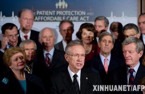 12月23日,在美國(guó)首都華盛頓,參議院多數(shù)黨(民主黨)領(lǐng)袖哈里·里德(前中)在參議院就醫(yī)療改革法案進(jìn)行最終一輪投票前舉行的新聞發(fā)布會(huì)上發(fā)言。美國(guó)國(guó)會(huì)參議院24日清晨投票通過(guò)了美國(guó)總統(tǒng)奧巴馬支持的全面醫(yī)療改革法案。法案的核心是創(chuàng)建一個(gè)聯(lián)邦監(jiān)管的醫(yī)療保險(xiǎn)市場(chǎng),而政府將成立公共保險(xiǎn)機(jī)構(gòu)出售醫(yī)療保險(xiǎn)。新華社/法新