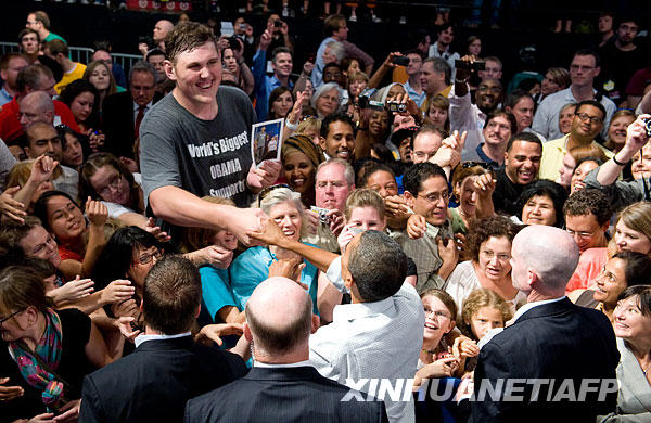 9月12日,在美國(guó)明尼蘇達(dá)州的明尼阿波利斯,美國(guó)總統(tǒng)奧巴馬(下,中)發(fā)表關(guān)于醫(yī)療改革方案的演講后與一名身高達(dá)2.3米的支持者握手。當(dāng)天,奧巴馬向過(guò)萬(wàn)名現(xiàn)場(chǎng)聽(tīng)眾闡述醫(yī)療改革方案。他還指責(zé)反對(duì)醫(yī)改者利用“恐嚇手法”阻撓改革。新華社/法新