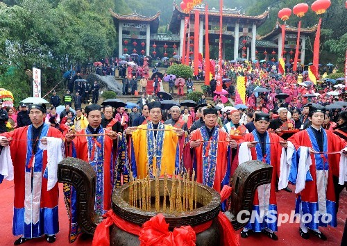 中新社福清一月二日 (詹托榮)二日,來自臺灣道教總廟無極三清總道院、臺灣凈明忠孝道教會等臺灣宮觀的近五百名道教信眾和大陸各地的道教信眾共千余人,齊聚素有“中華夢鄉”美譽的福建福清石竹山,參加在此開幕的海峽兩岸道教圓夢之旅暨第二屆中華夢鄉石竹山夢文化節。