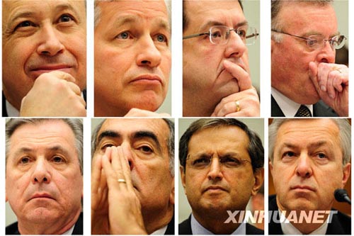 2月11日,獲得7000億美元“不良資產救助計劃”(TARP)的前八家銀行的CEO在華盛頓國會山出席美國國會眾議院金融委員會舉行的聽證會,就救助款項的去向進行作證。圖為出席聽證會的富國銀行總裁兼CEO約翰·斯頓夫,花旗銀行CEO維克拉姆·潘迪特,摩根士丹利投資銀行總裁兼CEO約翰·麥克,道富銀行總裁兼CEO羅納德· 洛格(下排從右至左),美洲銀行總裁兼CEO肯·盧伊,紐約梅隆銀行總裁兼CEO羅伯特·凱利,摩根大通公司CEO詹姆斯·迪蒙,高盛公司CEO兼總裁勞埃德·布蘭克芬(上排從右至左)。新華社記者 張巖攝