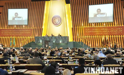 《聯合國反腐敗公約》第三次締約國會議在卡塔爾開幕。11月9日,與會者在卡塔爾首都多哈參加《聯合國反腐敗公約》第三次締約國會議。為期5天的《聯合國反腐敗公約》第三次締約國會議9日在卡塔爾首都多哈開幕,來自公約締約國、簽署國及多個聯合國專門機構和非政府組織的代表約1000人出席會議。 本屆會議將就建立一個審議各國履行《聯合國反腐敗公約》情況的機制進行討論。同時,與會代表還將就如何追回被腐敗分子帶到境外的資產等問題進行探討。新華社記者杜健攝