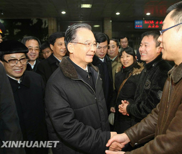 11月12日,中共中央政治局常委、國務院總理溫家寶趕赴河北暴雪地區指導工作。圖為抵達石家莊后,溫家寶前往火車站候車室看望旅客。新華社記者劉衛兵攝