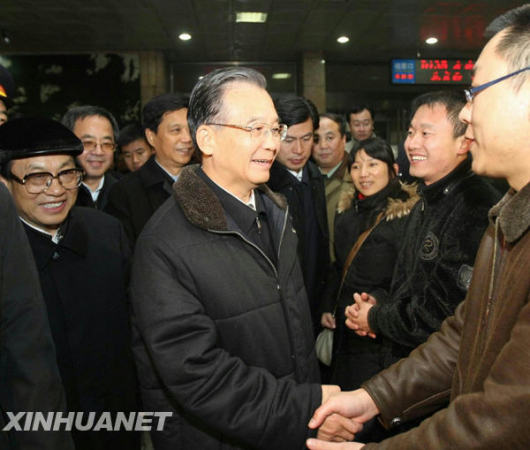 抵達石家莊火車站后,溫家寶隨即來到候車室看望旅客,和大家親切交談。他說,鐵路基本暢通,運力有保障,請大家放心。他同時要求鐵路運輸部門做好服務工作,把旅客照顧好。