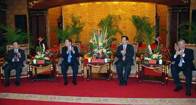 圖:泉州市委書記鄭道溪(右二)、福建省閩臺經(jīng)貿(mào)合作促進會副主任鄒爾均(右一)會見國民黨副主席關中(左二)、全國臺企聯(lián)會會長張漢文(左一)及出席“2007泉臺產(chǎn)業(yè)合作投資洽談會”的臺商代表( 來源:香港大公報)
