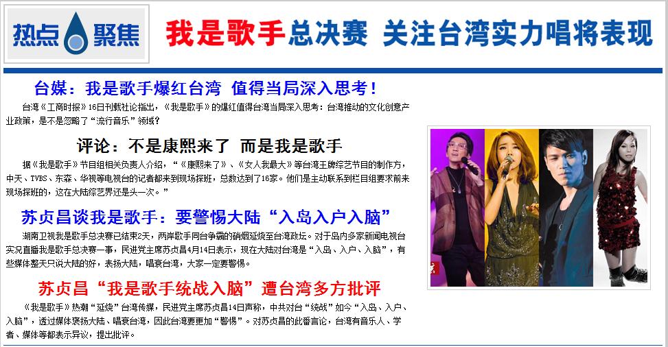 《我是歌手》總決賽,4名臺灣唱將引發島內廣泛關注,多家電視臺也因此予以大篇幅報道。(圖片來源:中國臺灣網)
