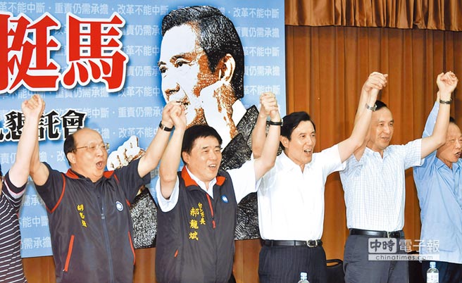 郝朱胡挺馬,馬英九(上圖中)為連任國民黨主席全力沖刺,懇托會上臺北市長郝龍斌(左二)、新北市長朱立倫(右二)及臺中市長胡志強(左)聯袂力挺高票連任。圖片來源:臺灣《中國時報》