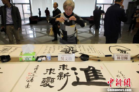 兩岸年度漢字揭曉后,閩臺(tái)知名書法家現(xiàn)場潑墨揮毫,書寫各種字體的“進(jìn)”字。臺(tái)灣書法家張炳煌的附注為“兩岸交融同躍進(jìn),九州鼎盛享安和”,基隆市書道會(huì)理事長張明萊則寄語“書寫兩岸民意,共同推進(jìn)和平繁榮”。