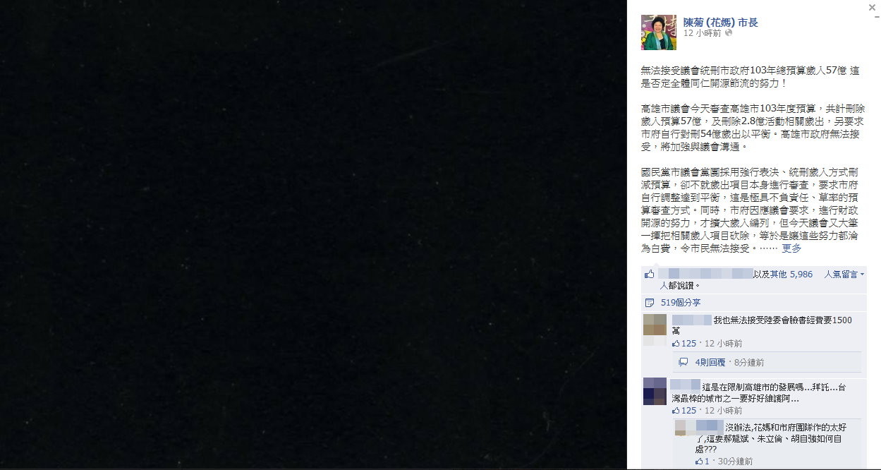 陳菊臉書PO全黑照片,抗議市議會刪預算。(臺媒翻拍陳菊市長臉書)
