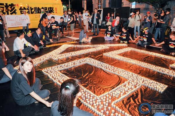 20時14分一到,所有參與群眾高舉手機、高喊“2014終結核四”口號,并齊唱“島嶼天光”,隨后便往凱道集結;凱道現場除以小蠟燭點燈,排出活動主題“命”字外,更以激光束把“反核”二字打在馬辦上,整場活動晚間10點左右結束。(中國臺灣網 高旭)