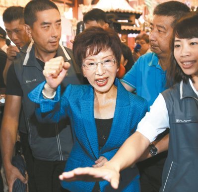 國民黨2016參選人洪秀柱(中)昨天到永和保福宮參加慶贊中元大法會(huì)。(圖片來源:臺(tái)灣《聯(lián)合報(bào)》)
