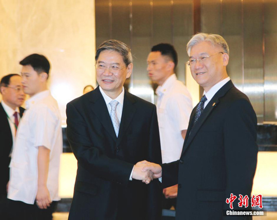 資料圖:5月23日,國(guó)務(wù)院臺(tái)辦主任張志軍(左)在金門,與臺(tái)灣方面陸委會(huì)主委夏立言(右)舉行會(huì)面。圖為張志軍抵達(dá)會(huì)場(chǎng)時(shí),與夏立言握手致意并交談。黃少華 攝