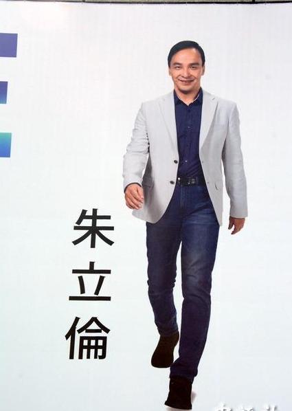 總部正面的新的文宣看板,是主軸文宣與人形的組合,有朱立倫的全身照,著深藍T恤、牛仔褲,淺白的西裝外套,跨步向前的姿態(tài),是一幅形象清新的型男裝扮。