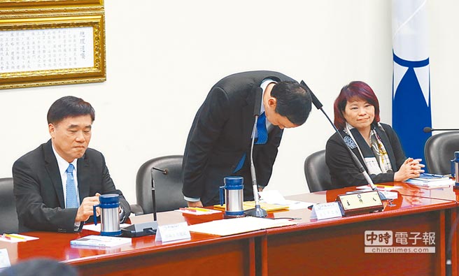 國民黨18日舉行臨時中常會,前主席朱立倫(中)向中常委報告,敗軍之將必須負起最大責(zé)任,并深深鞠躬致歉,由黃敏惠(右)暫代主席。(圖/臺灣《中國時報》 陳信翰攝)