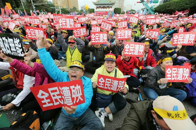 數萬抗議臺當局年金改革群眾于農歷春節前夕,云集到蔡辦門前的凱達格蘭大道,怒轟民進黨當局執政無能,要蔡英文下臺。(圖片來源:臺灣《中時電子報》)