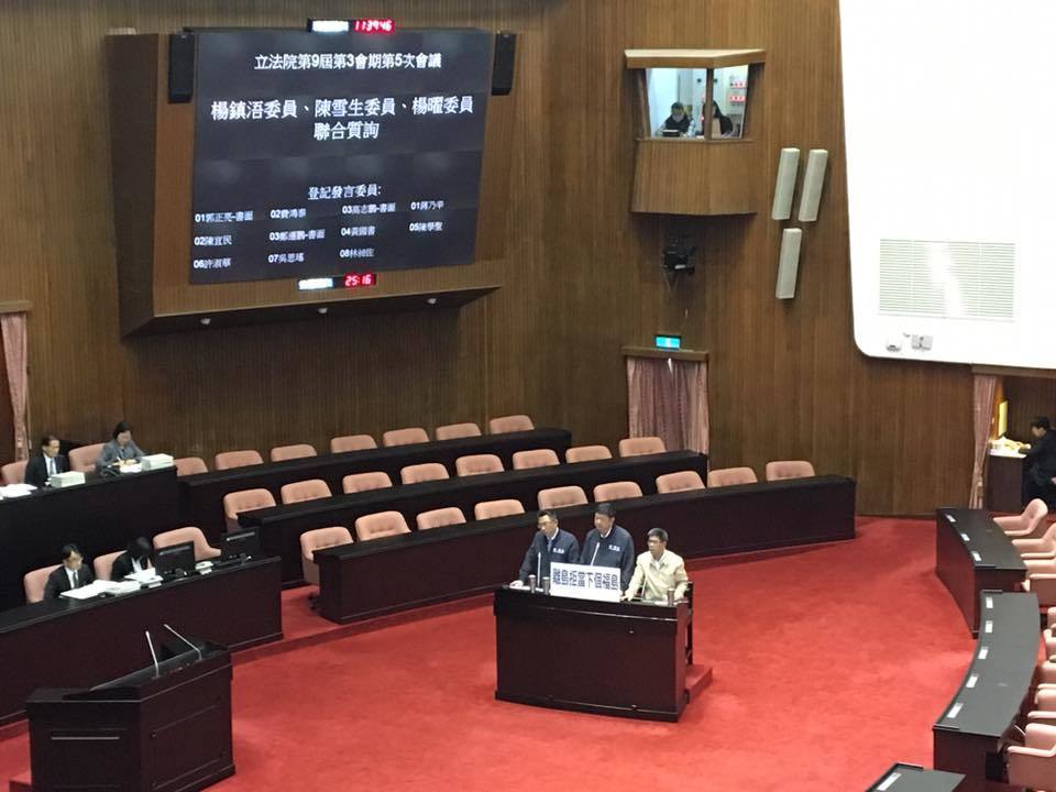 離島“立委”楊鎮(zhèn)浯、陳雪生、楊曜在“立法院”總質(zhì)詢時(shí),聯(lián)合質(zhì)詢官員。