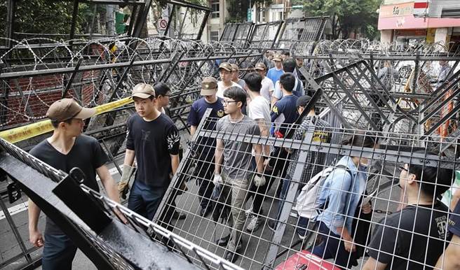為因應監督年金改革行動聯盟及“800壯士”的“夜宿圍城”行動,臺“立法院”周圍架起層層蛇籠拒馬,留下迷宮般的通道。(圖片來源:臺灣“中時電子報”)
