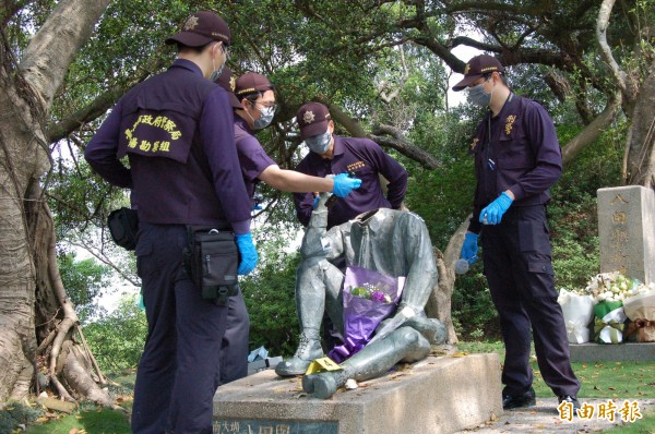 臺當局忙派人對被斬首的八田與一銅像取證(圖片來源:《自由時報》)