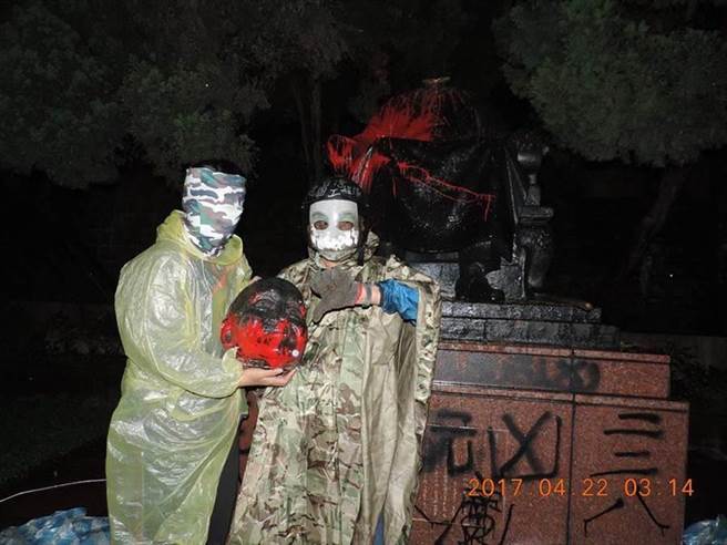 臺灣“獨派”團體“臺灣獨立建國工程隊”“斬首”蔣介石銅像,兩名“臺獨”分子均戴面具。(圖片來源:臺“中時電子報”)