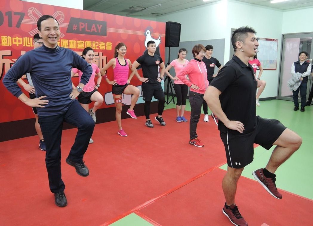 新北市長朱立倫(左)在年初時,跟著運動教練示范甩油操。(圖片來源:臺灣《聯合報》)