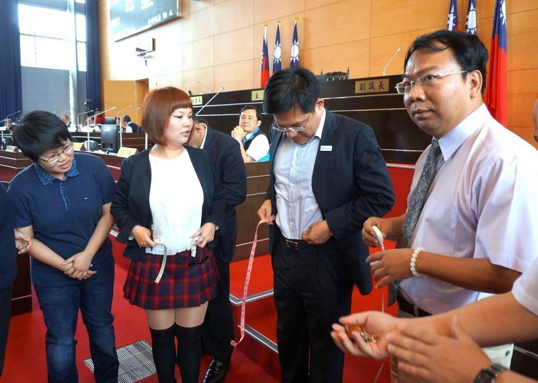 今年6月,民進黨議員質詢時拿出皮尺,當場要林佳龍量腰圍。(圖片來源:臺灣《聯合報》)