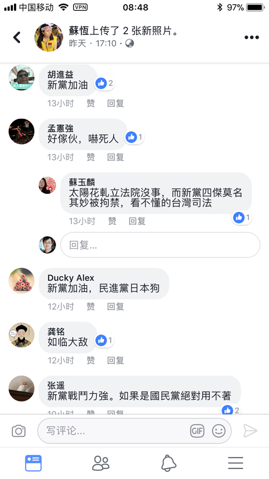 “你我都可能成為下一個(gè)王炳忠?”這同樣是在臺(tái)灣社交網(wǎng)絡(luò)上頻繁出現(xiàn)的問句。由于臺(tái)當(dāng)局在王炳忠家只搜出幾份簡(jiǎn)體字賬冊(cè)和數(shù)張人民幣現(xiàn)鈔,很多臺(tái)灣網(wǎng)友也開始以此為梗諷刺民進(jìn)黨,此前表示希望加入中國(guó)共產(chǎn)黨的臺(tái)生王裕慶凌晨在朋友圈貼出一份學(xué)習(xí)十九大文件和一張1元人民幣鈔票:“估計(jì)明天臺(tái)灣檢調(diào)在我宿舍只會(huì)搜到這些‘罪證’,對(duì)不起,臺(tái)灣檢調(diào),人民幣那么少,完全是‘共犯’馬云的原因,我招供,我是用了支付寶!”
