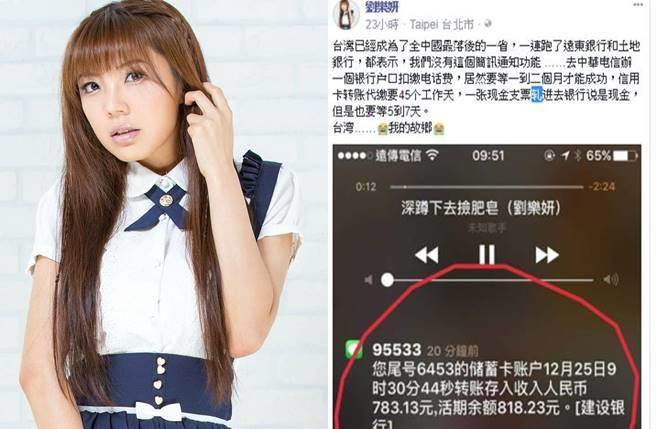 劉樂(lè)妍昨日在臉書(shū)發(fā)文,開(kāi)頭就炮轟“臺(tái)灣已經(jīng)成為了全中國(guó)最落后的一省”。她表示,在臺(tái)灣趁著空檔去了遠(yuǎn)東銀行和土地銀行辦事,才發(fā)現(xiàn)沒(méi)有短信通知功能;去“中華電信”申辦銀行戶頭繳電話費(fèi),沒(méi)想到作業(yè)流程竟需要一到二個(gè)月;信用卡代繳要45個(gè)工作日,就連現(xiàn)金支票入到銀行也要等5到7天。如此的低效讓她不得不感嘆:“臺(tái)灣…我的故鄉(xiāng)”。(中國(guó)臺(tái)灣網(wǎng) 楊永青)