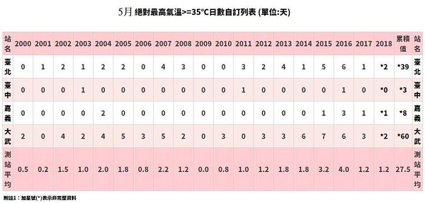 2018年5月才剛過半,臺北、大武超過或等于35度的天數(shù)則是2天。(中國臺灣網(wǎng) 娟子)