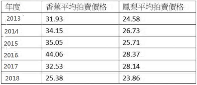 北農(nóng)近年來拍賣香蕉、菠蘿平均價格。(數(shù)據(jù)源:臺北農(nóng)產(chǎn)運銷公司 單位:元新臺幣/每公斤)