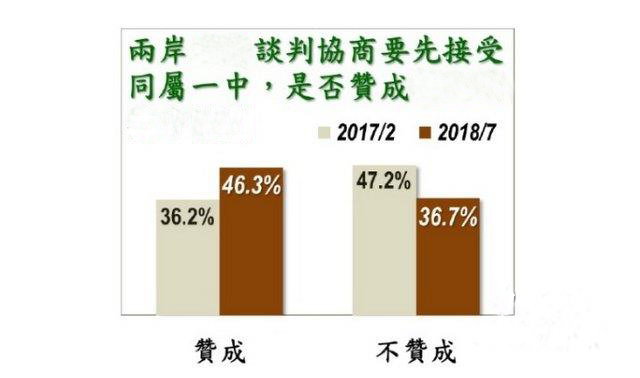 中國臺灣網(wǎng)8月1日訊 針對當前兩岸關(guān)系形勢,十九大工作報告中明確指出,“承認‘九二共識’,認同兩岸同屬一個中國,兩岸雙方就能開展對話”。而臺灣島內(nèi)最新出爐的民調(diào)顯示,“若兩岸要進行任何談判協(xié)商,都需先表示接受兩岸都屬于一個中國”,有46.3%臺灣民眾贊成在此情形下,臺當局領(lǐng)導(dǎo)人蔡英文與大陸展開談判協(xié)商,比例高于選擇不贊成的36.7%。